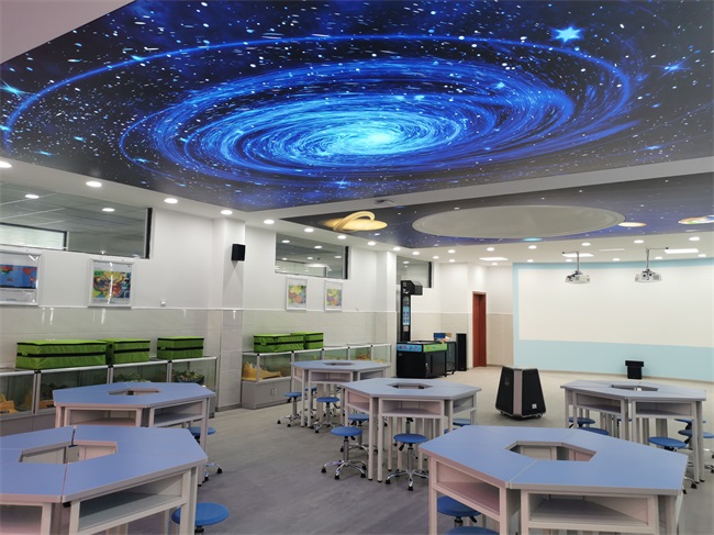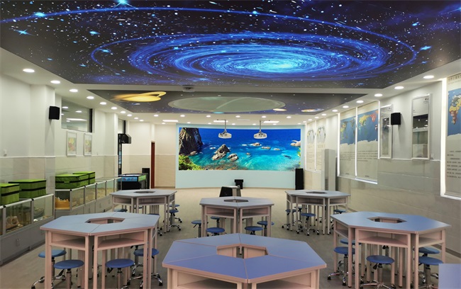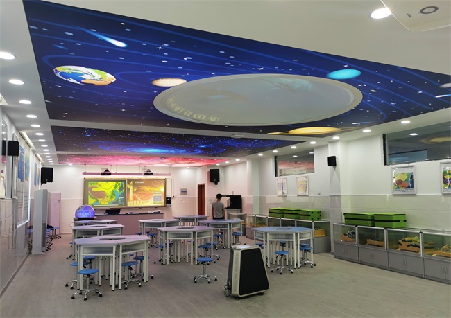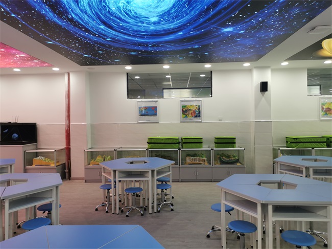 深邃的藍色、小組學習式的課桌椅以及四周的地理知識窗簾和地形地貌模型,羿飛地理專用教室一改傳統(tǒng)教室的設(shè)計布局,以更清新自由的形象展現(xiàn)在師生面前。